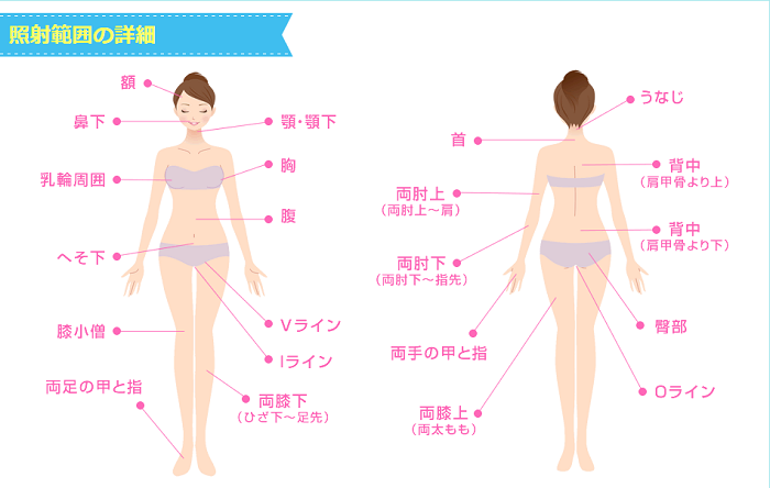 | ひたい、鼻下、あご、あご下、乳輪周囲、胸、腹、へそ下、両足の甲・指、両ひざ下、首、うなじ、背中上、背中下、両肘上、両肘下、両手の甲・指、お尻、両ひざ上、Vライン、Iライン、oライン |