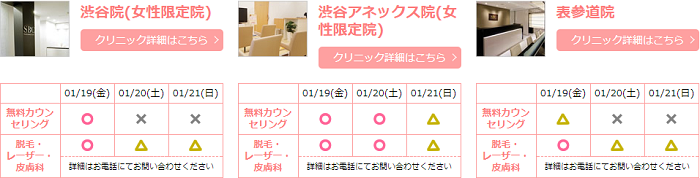 さらに公式サイトの『クリニック別空き状況一覧』を見ると、直近3日の予約状況が一目でわかるので、空き状況を見て予約を取ればOK!